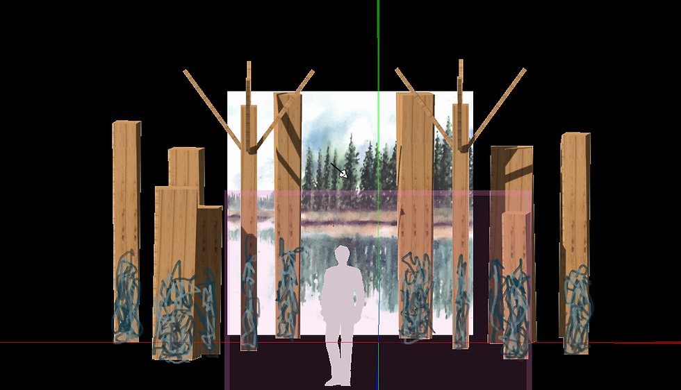 My central concept was rooted in the main character’s connection to water and trees as sources of home and grounding. This led me to build a design language centered on raw lumber, alongside a consistent palette of blues and greens that remained present throughout the piece.